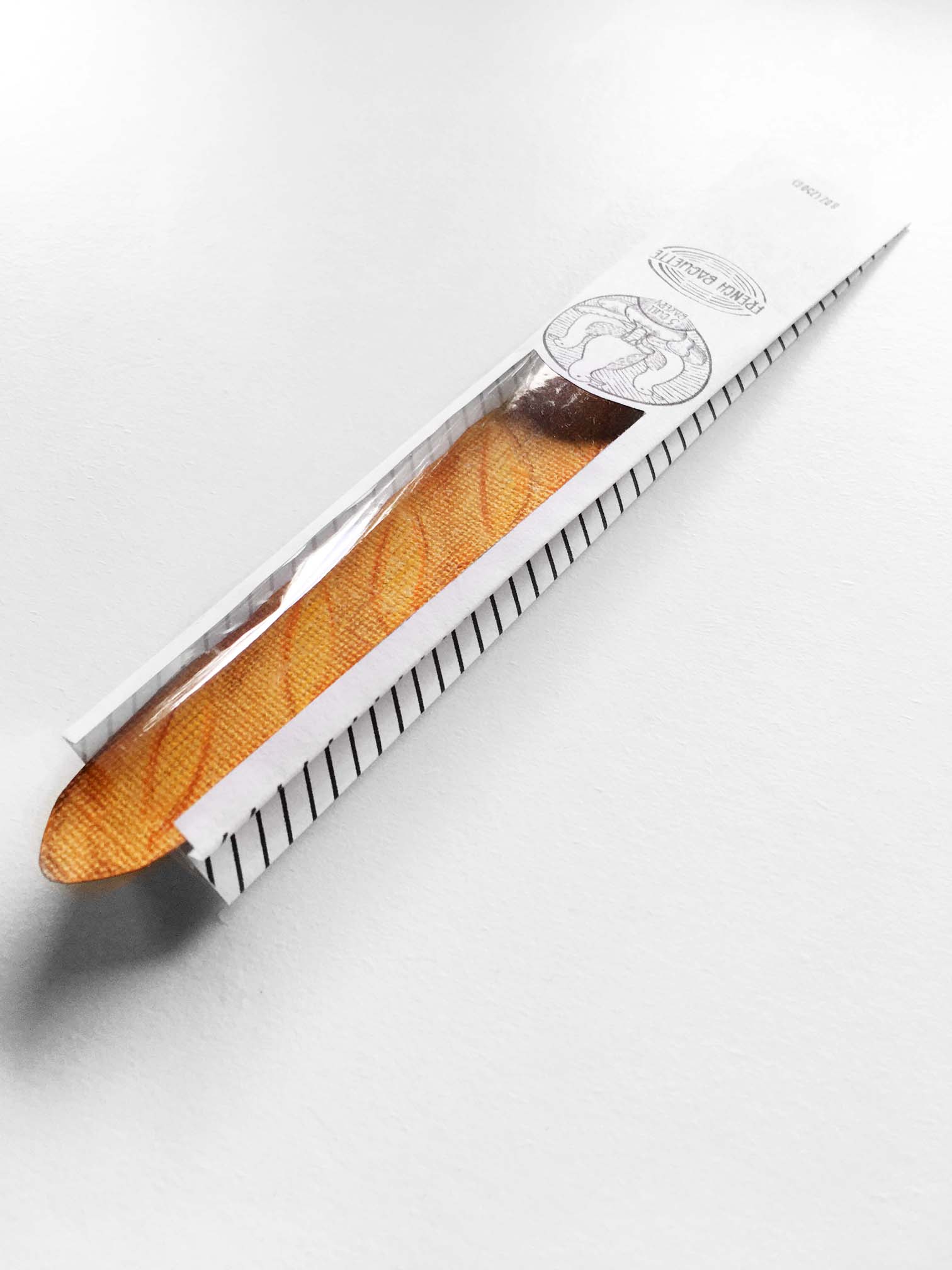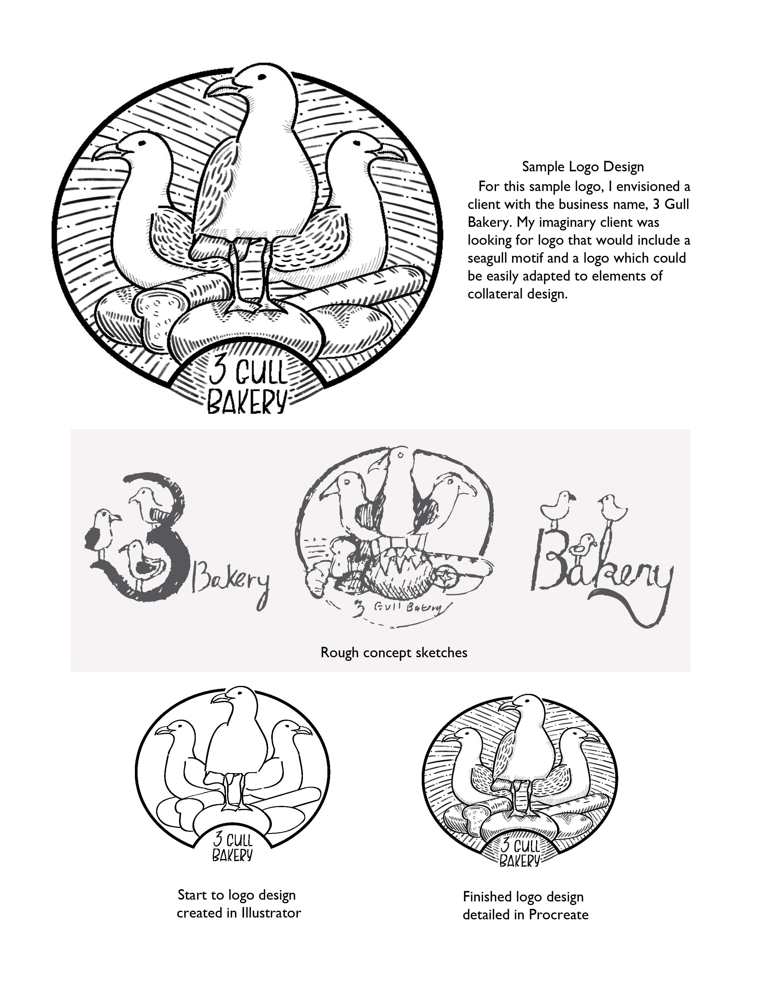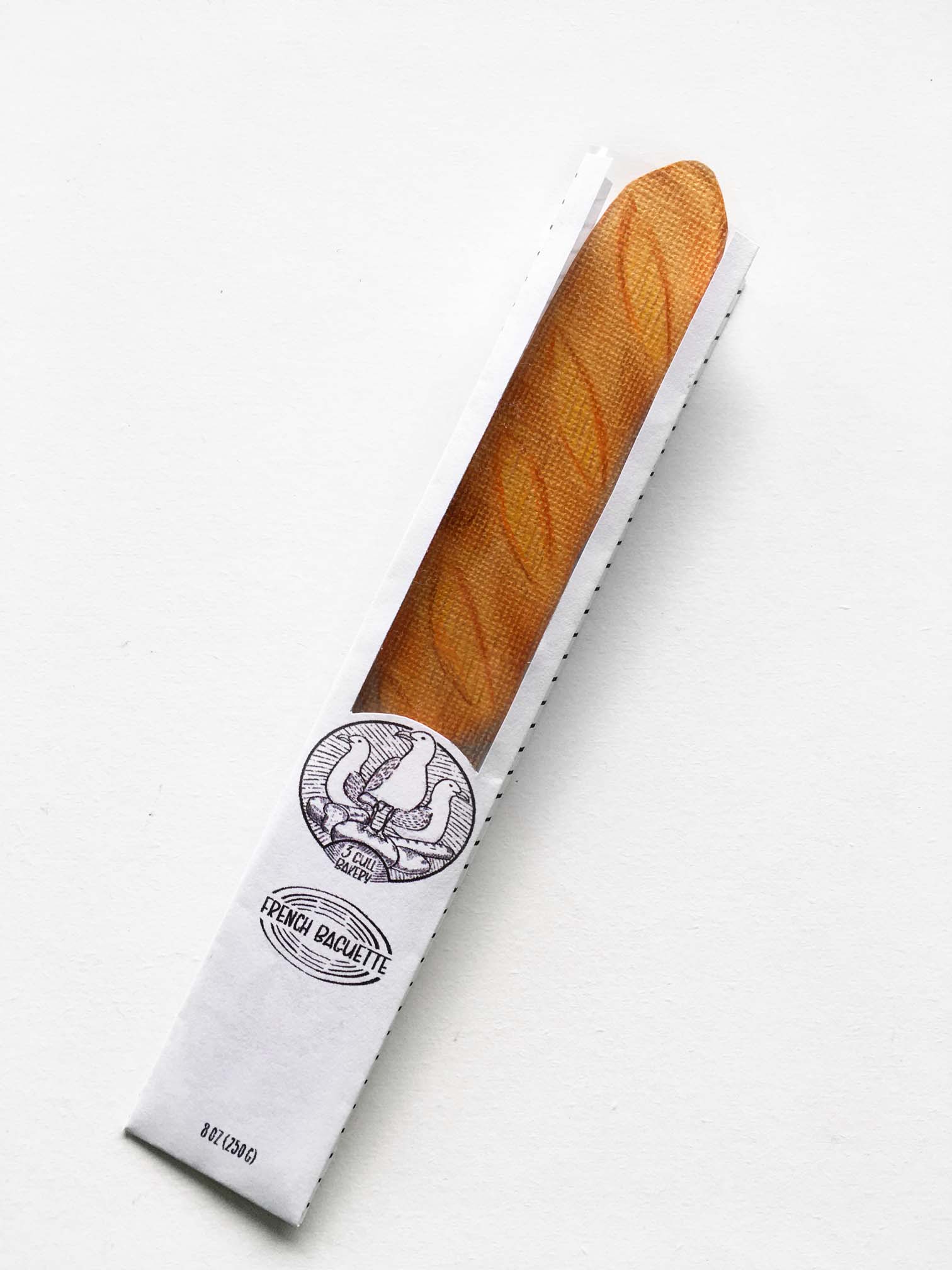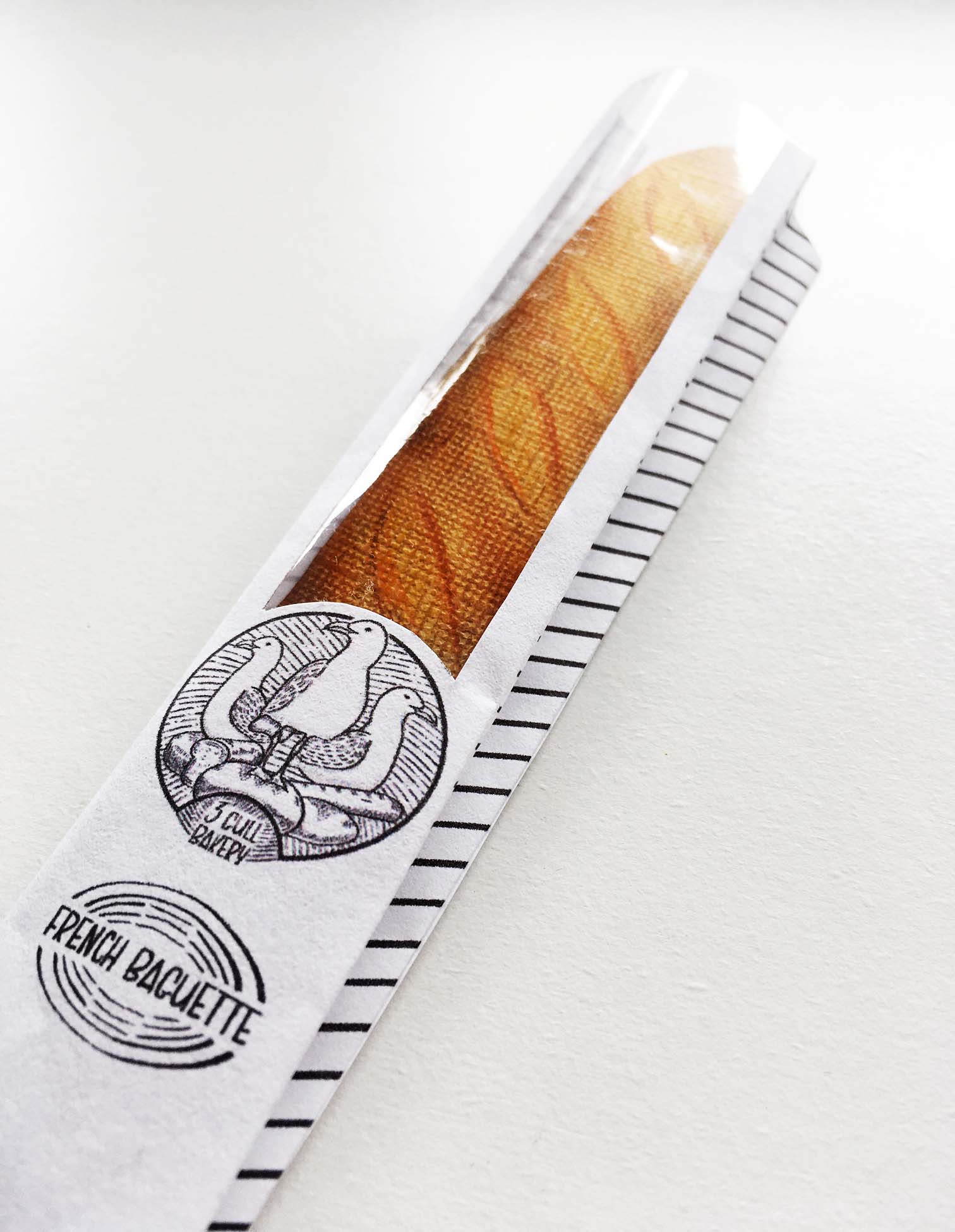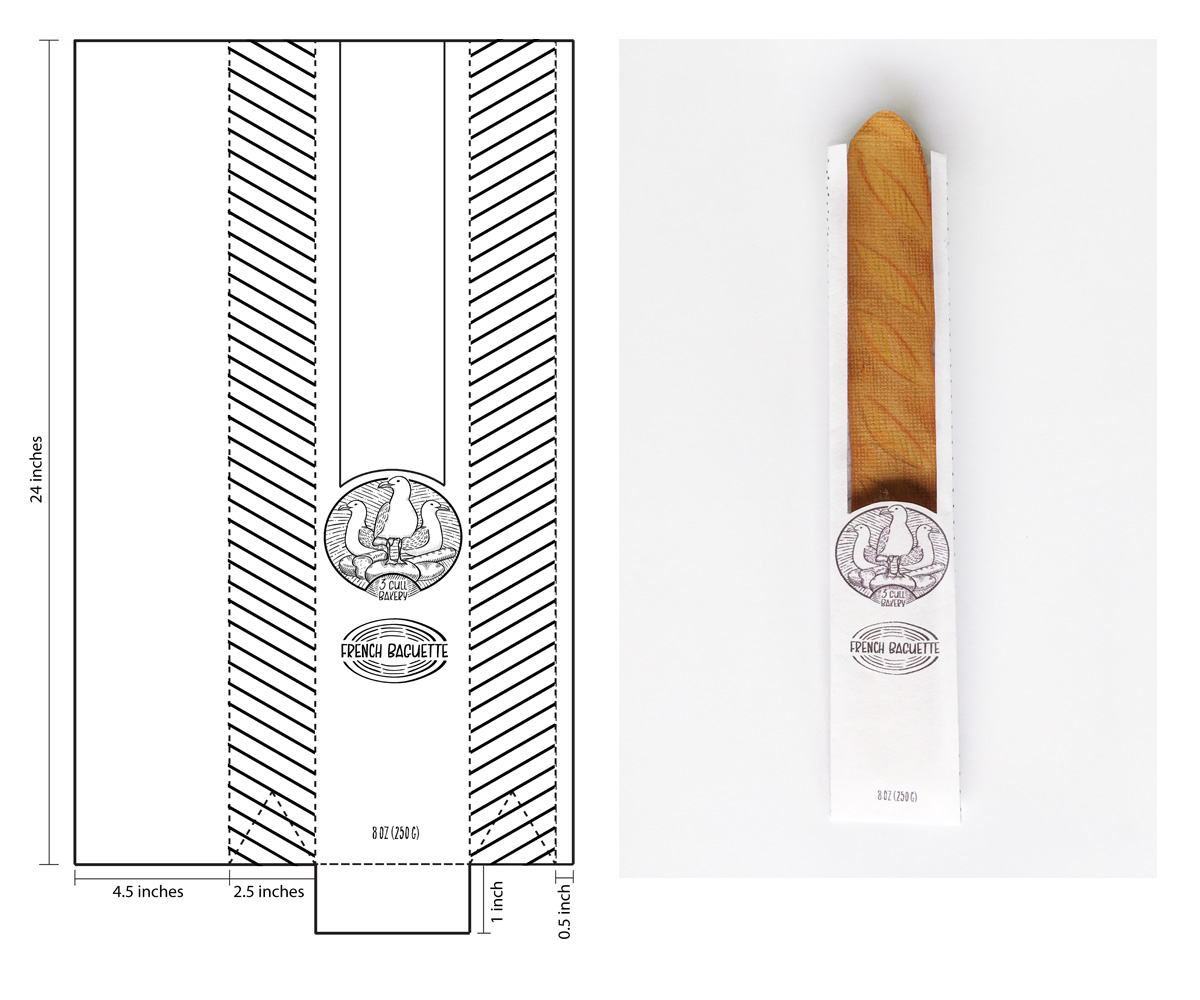 Template design (left) for baguette bag including 3 Gull Bakery logo