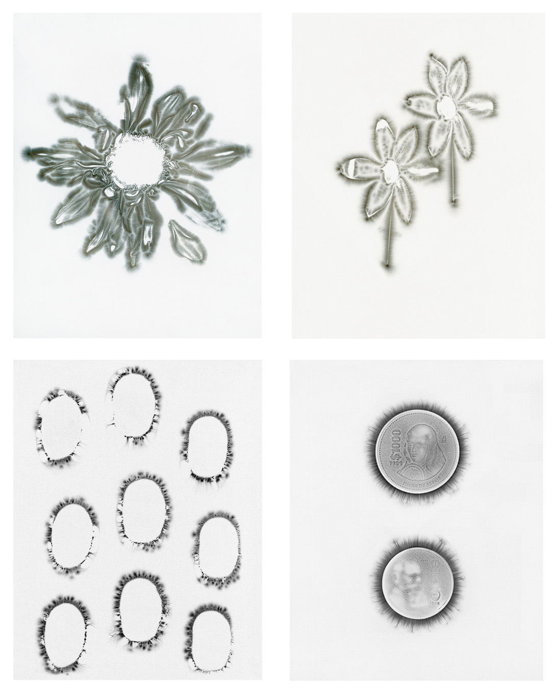 In 2009, I submitted a series of Kirlian photographs to accompany my undergraduate thesis, which explored the boundaries between photography’s use as a scientific/observational tool and art. The following images were created using a process in which objects are placed directly onto film and then shocked with an electrical current. The lines that emanate from the border of each object are known as a corona discharge.